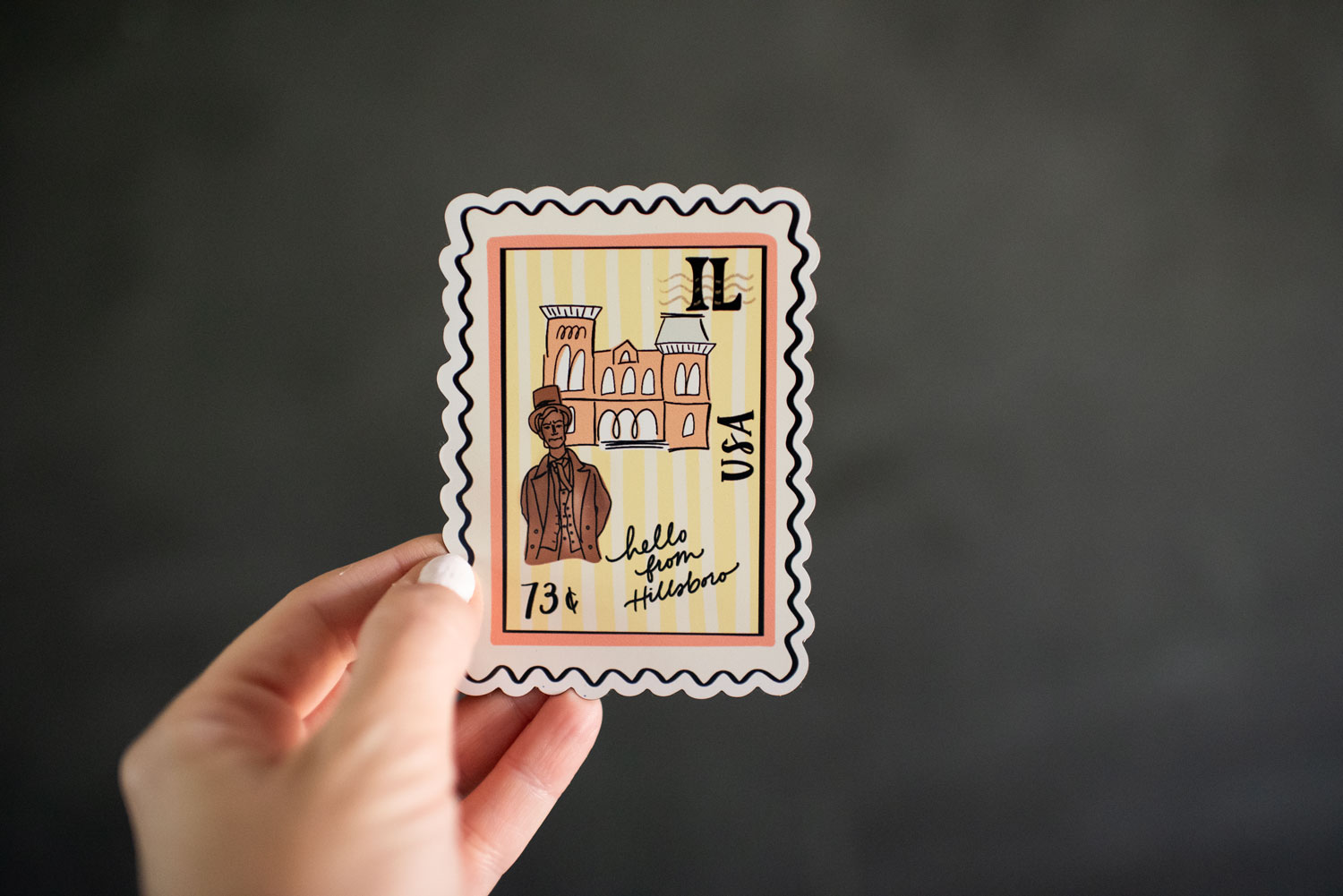 Celebrate small-town charm with this illustrated Hillsboro postage stamp magnet, designed to bring a touch of nostalgia to any space. Inspired by classic vintage stamps, this piece features a hand-drawn Hillsboro landmark paired with the charming Abe Lincoln statue, giving the magnet a timeless, storybook feel. Warm tones, bold outlines, and soft yellow stripes make the design eye-catching while still feeling playful.