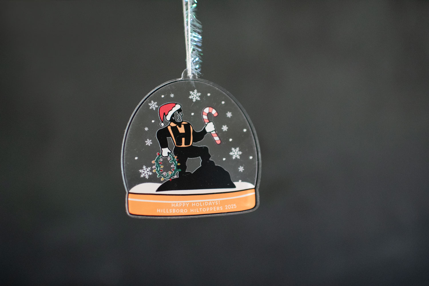 Celebrate the charm and history of the Hillsboro Hiltoppers with this fun holiday ornament. The ornament features a carefully detailed design that highlights iconic elements of the Hiltopper mascot holding a candy cane, and carrying a string of lights. Made from high-quality acrylic, this ornament is both durable and beautifully finished, making it ideal for hanging on the Christmas tree, or a sweet topper to any gift.